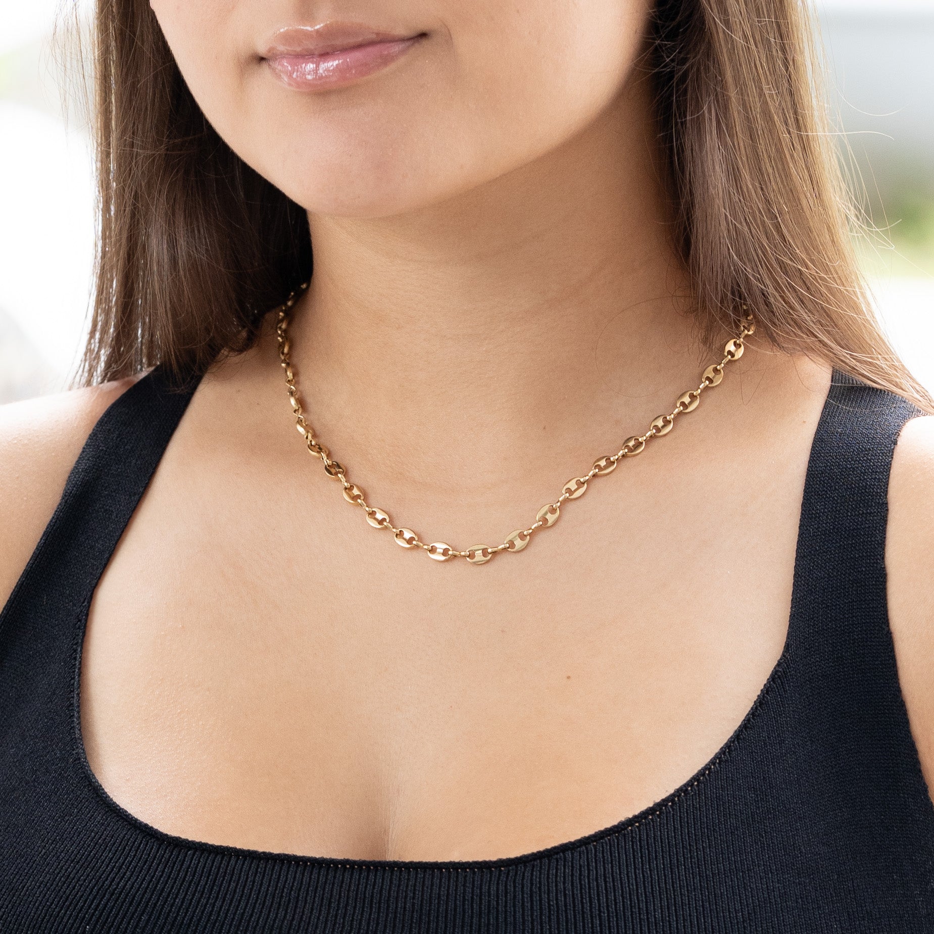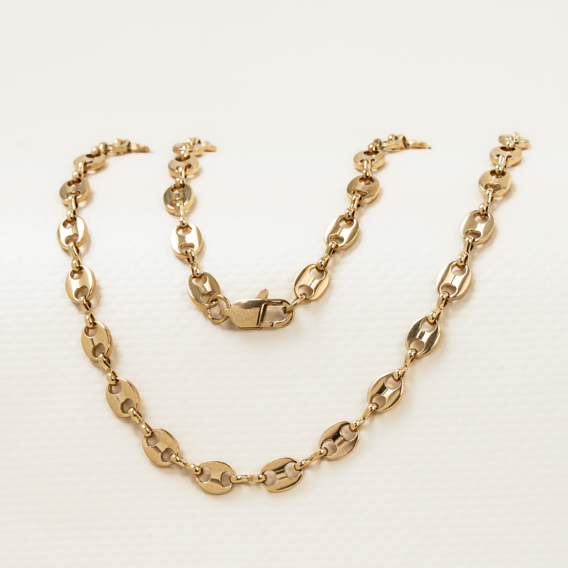 Cadena Grano de Café de Oro Laminado Italiano 18K con diseño clásico y acabado brillante. Perfecta para usar sola o con otros accesorios, combina elegancia y durabilidad. Una pieza resistente que mantiene su belleza a lo largo del tiempo, ideal para realzar cualquier look. Todas nuestras joyas son contramarcadas en sus broches (por un lado el doble lingote que nos identifica y por le otro el 18K).