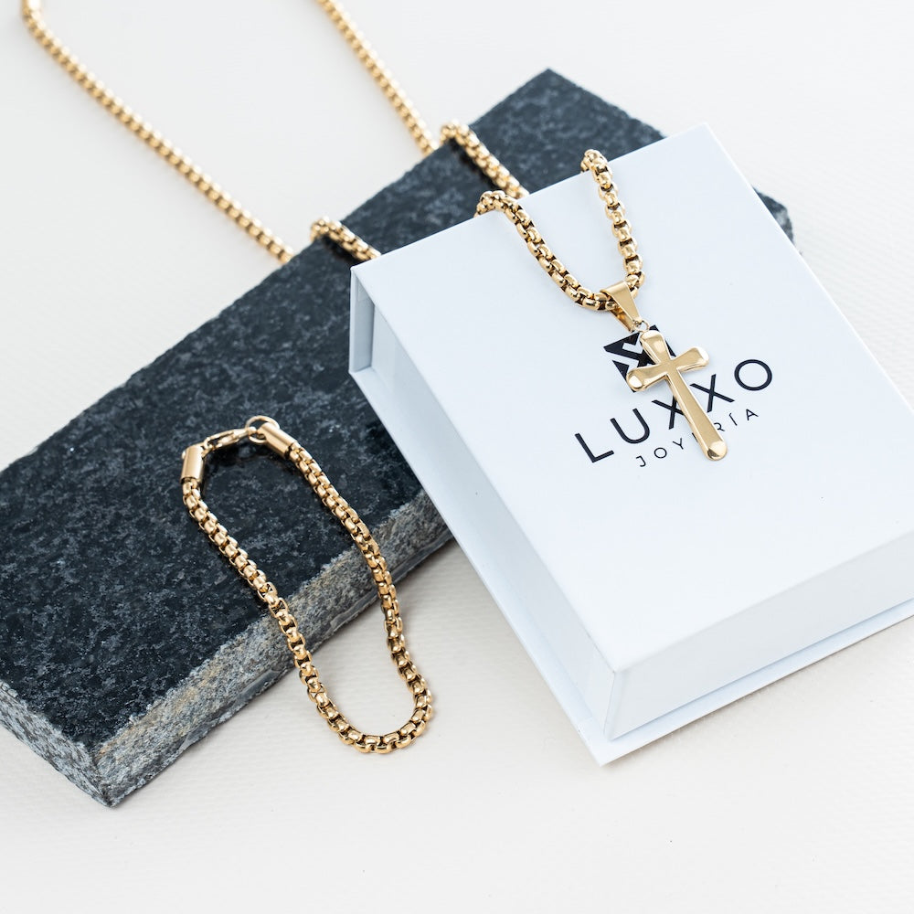 - Combo de Cadena, Pulsera y Dije de Oro Laminado Italiano 18K con diseño clásico y acabado brillante. Combina elegancia y durabilidad. Una pieza resistente que mantiene su belleza a lo largo del tiempo, ideal para realzar cualquier look. Todas nuestras joyas son contramarcadas en sus broches (por un lado el doble lingote que nos identifica y por le otro el 18K).