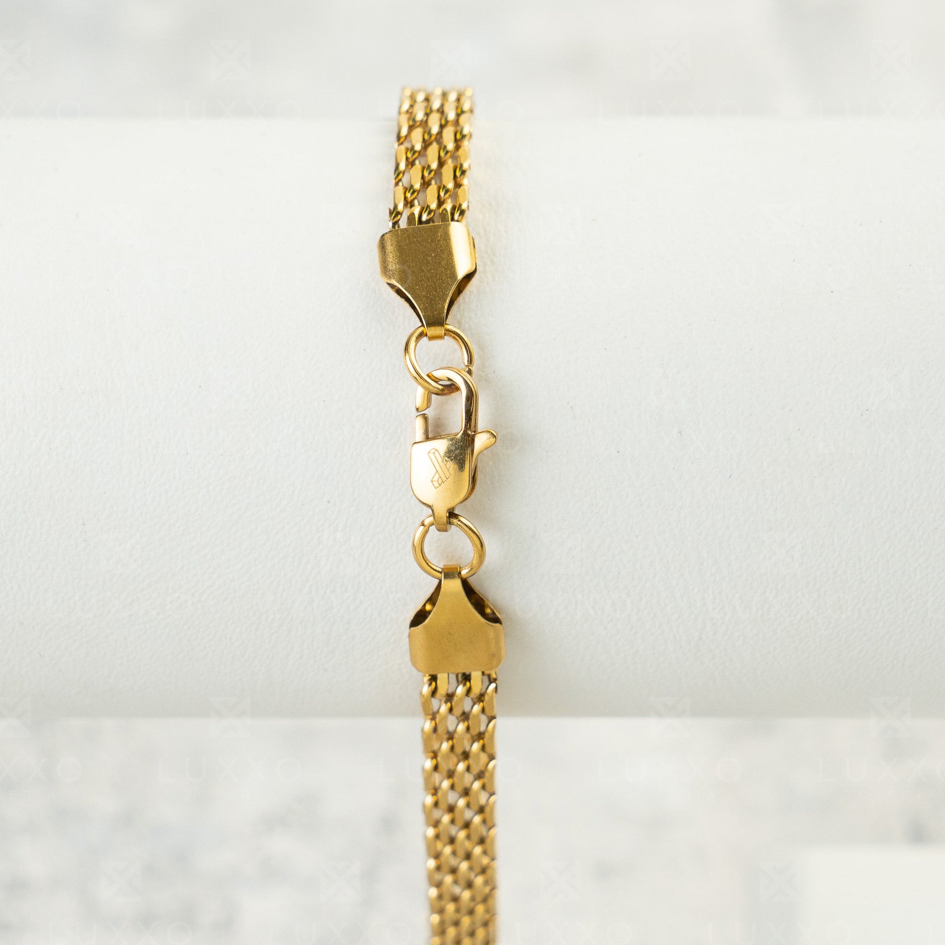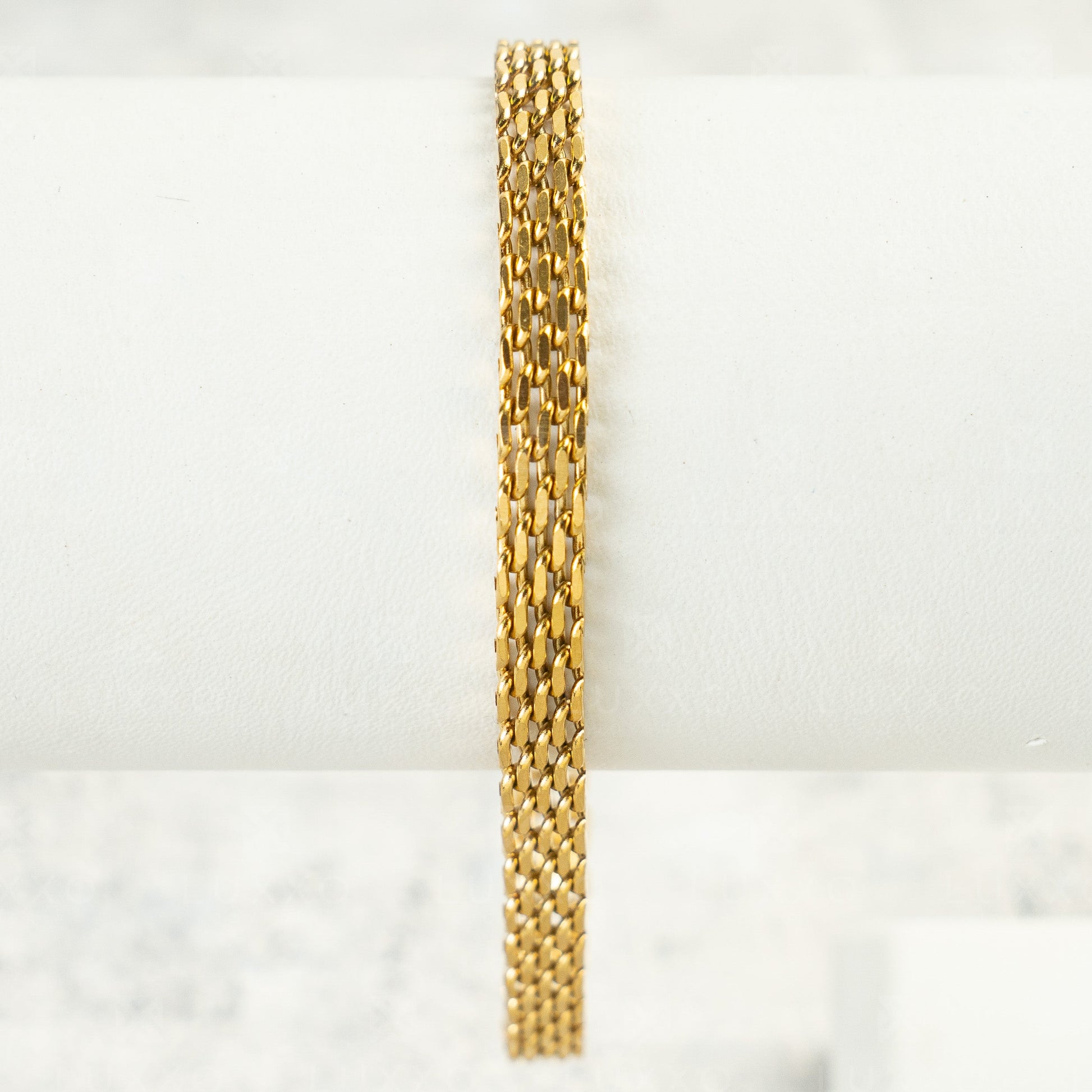 Pulsera de Oro Laminado Italiano 18K con diseño clásico y acabado brillante. Perfecta para usar sola o con otros accesorios, combina elegancia y durabilidad. Una pieza resistente que mantiene su belleza a lo largo del tiempo, ideal para realzar cualquier look. Todas nuestras joyas son contramarcadas en sus broches (por un lado el doble lingote que nos identifica y por le otro el 18K).